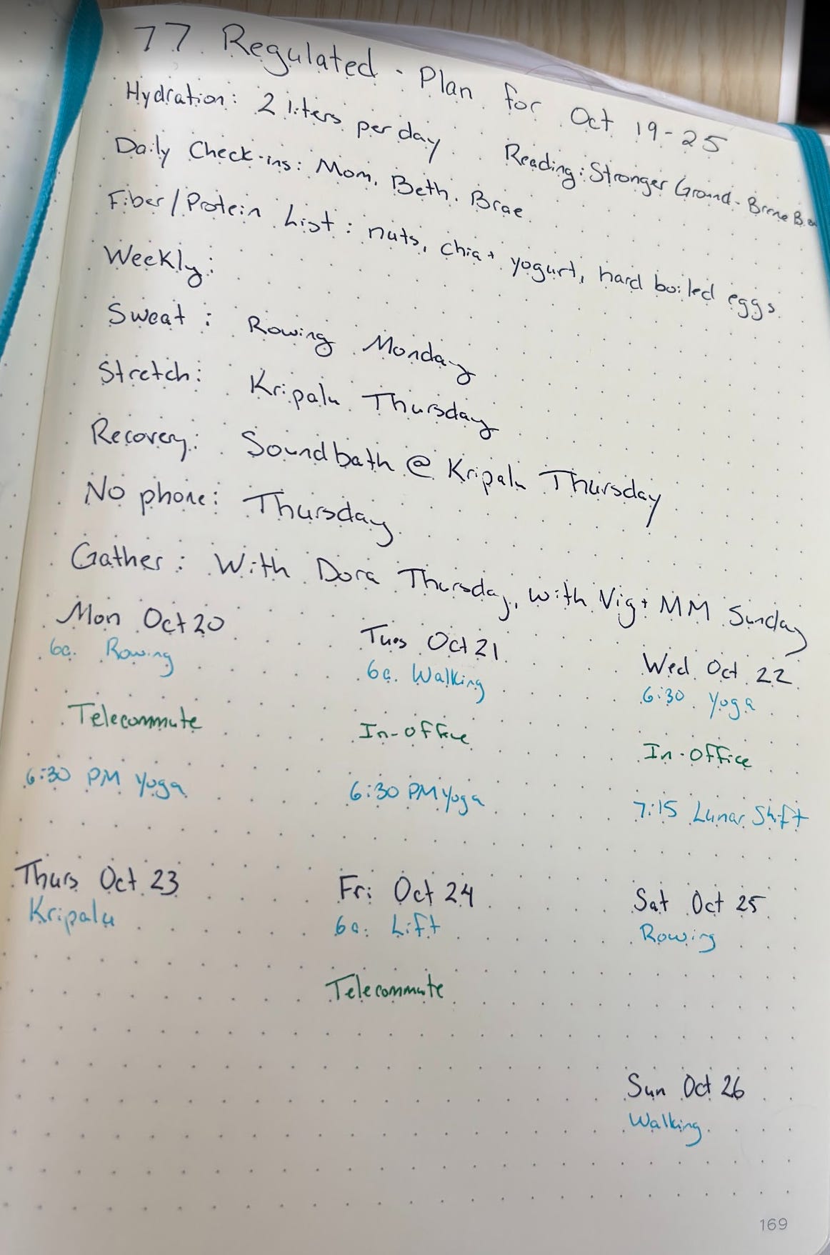 I usually take a little time on Friday afternoons to set up my bullet journal layout for the next week. This week I’ll add my 77 Regulated Plan, and keep my journal handy to do a reflection entry.